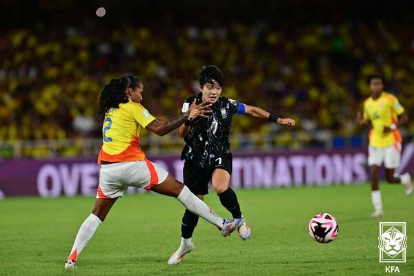 한국은 초반부터 강하게 밀어붙였다. 전반 21분 프리킥 상황에서 이금민이 길게 올려줬고 콜롬비아 수비수 머리를 거쳐 김미현이 헤더로 연결했지만 골문 위로 벗어났다. 전반 23분에는 정다빈이 상대 압박하며 뺏어낸 공을 전유경 거쳐 최유리가 날카롭게 슈팅했지만 골대 맞고 벗어났다.