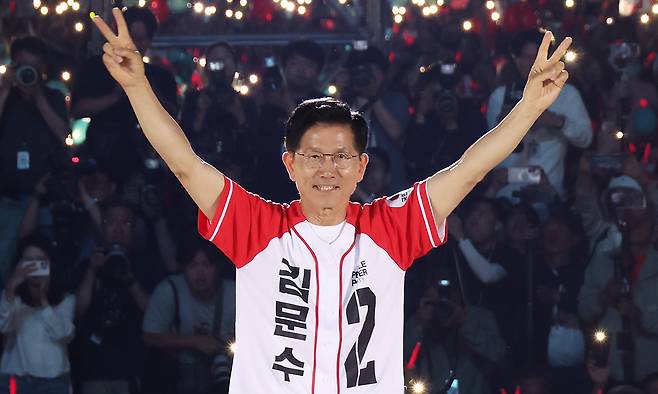 무대에는 부인 설난영씨와 딸 동주씨, 사위와 손자·손녀, 새미래민주당 이낙연 상임고문과 국민의힘 한동훈 전 대표 등도 함께 올랐다. 김 후보는 설씨의 손을 잡고 들어올리며 “제 아내가 대학을 나오지 않았다고, 발이 공중에 떠있다고 하지만 저는 제 아내를 사랑한다”고 말해 환호성을 받았다.