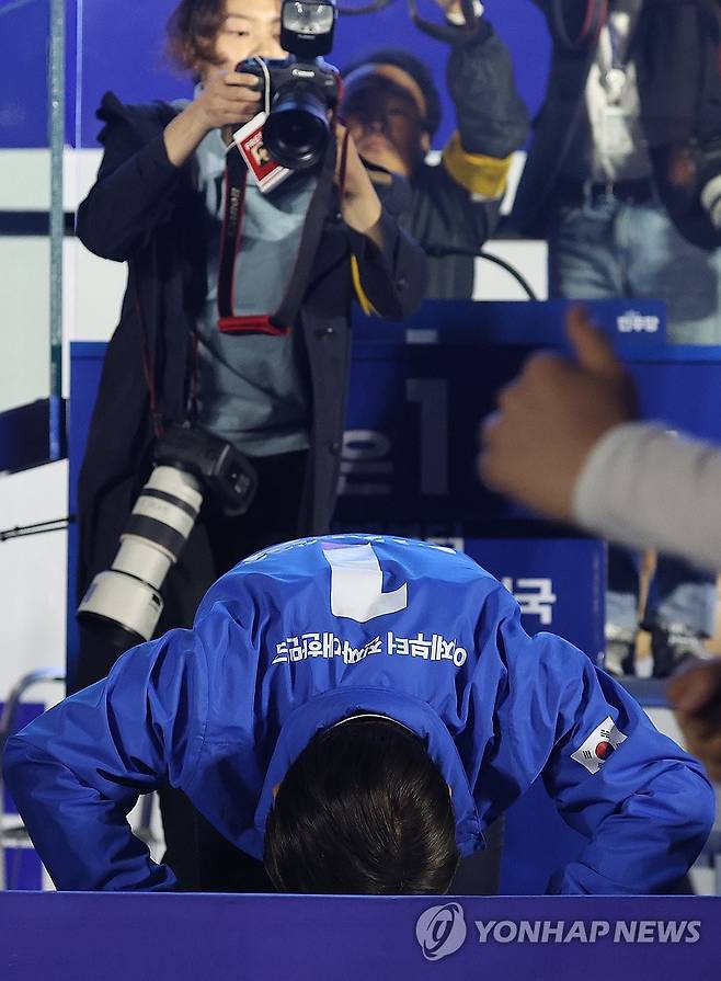 (서울=연합뉴스) 김도훈 기자 = 더불어민주당 이재명 대선 후보가 선거를 하루 앞둔 2일 서울 여의도공원 마지막 유세에서 연설을 마친 뒤 무대 앞으로 시민들에게 절하고 있다. 2025.6.2