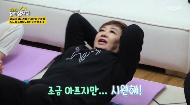 이어 폼롤러 위에서 고개 들고 코어 힘으로 버티는 동작도 선보였다. 호흡까지 완벽한 혜은이는 "조금 아프지만 시원하다"고 했고, 박원숙은 능수능란한 혜은이의 모습에 "왜 예뻐지나 했더니 고행을 한다"며 감탄했다.