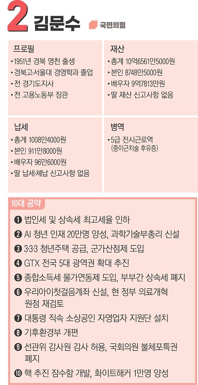 김 후보는 유세 내내 이 후보 비판에 힘을 쏟았다. 그는 서울 피날레 유세에서 이 후보를 겨냥해 “이제 정의가 이기고 범죄자들이 물러가고 있다”며 “여러분의 깨끗한 한 표가 새 역사를 창조할 것”이라고 말했다. 그는 이 후보가 유세에서 방탄벽을 설치하는 것을 들어 “저는 방탄조끼가 필요없다”며 자신이 입던 조끼를 풀어 헤쳤다. 그는 “국민 여러분이 제 방탄조끼”라며 “제 양심은 방탄유리”라고 말했다.