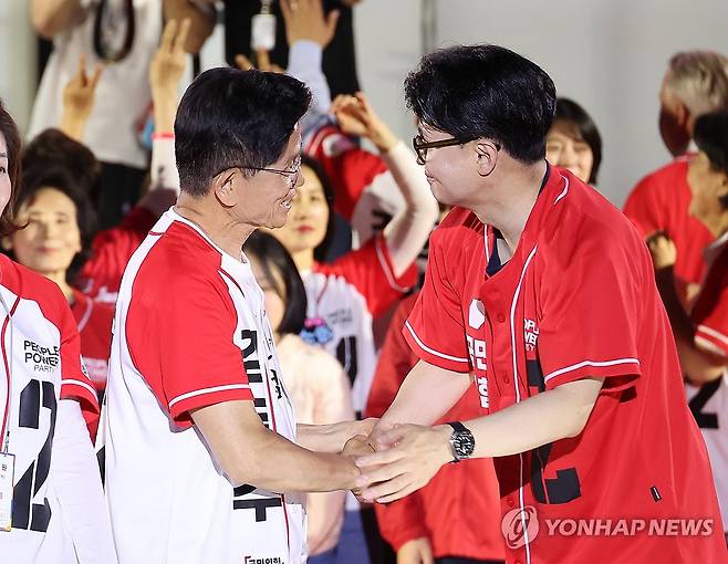 (서울=연합뉴스) 박동주 기자 = 국민의힘 김문수 대선 후보가 2일 서울시청 앞 서울광장에서 열린 피날레 유세에서 한동훈 전 대표와 대화하고 있다. 2025.6.2