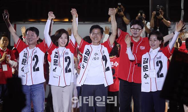 [이데일리 이영훈 기자] 김문수 국민의힘 대선 후보가 2일 서울시청 앞 서울광장에서 열린 피날레 유세에서 경선을 함께 뛴 선대위원장들과 지지를 호소하고 있다.