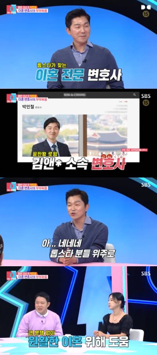 이날 박민철의 등장에 김구라는 "이혼 전문 변호사다. 톱스타들이 클라이언트로 있다"고 했고, 박민철은 "톱스타분들 이혼에 도움을 드렸다. 제가 나서서 이혼을 하라고 한 건 아니다"면서 웃었다.