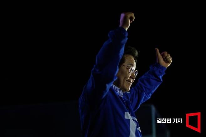 이재명 더불어민주당 대선 후보가 2일 서울 여의도공원 문화의마당에서 마지막 유세를 하고 있다.