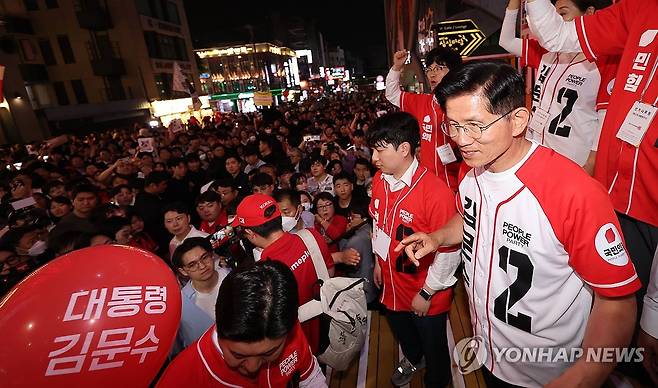 (서울=연합뉴스) 류영석 기자 = 국민의힘 김문수 대선 후보가 2일 서울 마포구 홍익대학교 일대에서 시민들에게 인사를 하고 있다. 2025.6.2 [공동취재]