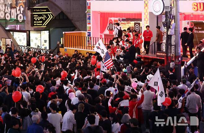 [서울=뉴시스] 권창회 기자 = 김문수 국민의힘 대선 후보가 2일 서울 마포구 KT&G 상상마당 인근에서 거리인사를 하며 시민들과 셀카를 찍고 있다. (공동취재) 2025.06.02. photo@newsis.com