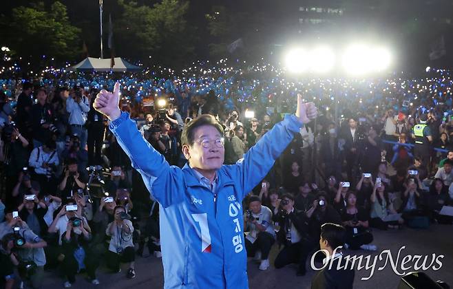 | ▲ 이재명 더불어민주당 대선 후보가 대선을 하루 앞둔 2일 서울 영등포구 여의도공원 문화의마당에서 열린 피날레 유세에서 엄지손가락을 들어 '기호1번' 지지를 호소하고 있다. |