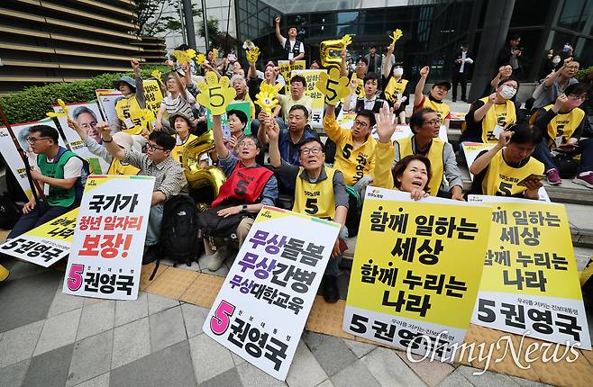 | ▲ 2일 오후 금속노조 거제통영고성조선하청지회 김형수 지회장이 고공농성 중인 서울 중구 한화빌딩 앞에서 열린 민주노동당 권영국 대통령후보의 유세에서 지지자들이 5번을 외치고 있다. |
