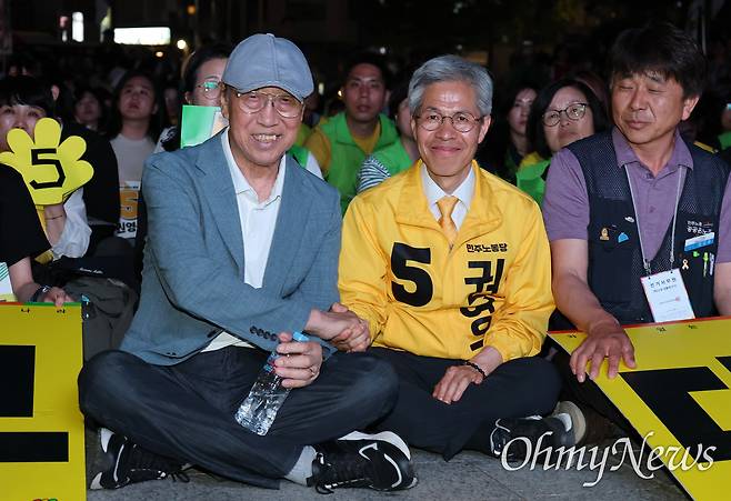 | ▲ 민주노동당 권영국 대통령후보가 2일 오후 서울 종로구 보신각 앞에서 열린 마지막날 유세에서 단병호 전 민주노총 위원장이자 전 민주노동당 국회의원과 인사를 나누고 있다. |