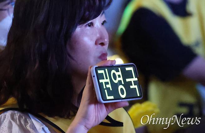 | ▲ 민주노동당 권영국 대통령후보의 한 지지자가 2일 오후 서울 종로구 보신각 앞에서 열린 마지막날 유세에서 휴대폰으로 이름을 만들어보이고 있다. |