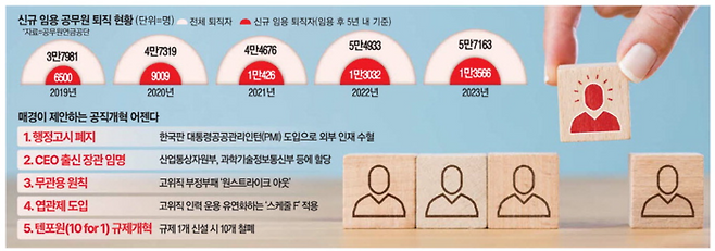 특히 한국에선 기수와 서열을 앞세우는 고시 출신 위주의 조직문화, 민간과 단절된 인사 운용은 급변하는 정책 환경에 대한 대응뿐만 아니라 업무 창의성을 억압하는 구조적 한계로 지적된다. 매일경제는 공직사회의 고질적인 문제를 해결하기 위한 전면적인 시스템 대전환을 이루자는 5가지 제안을 마련했다.