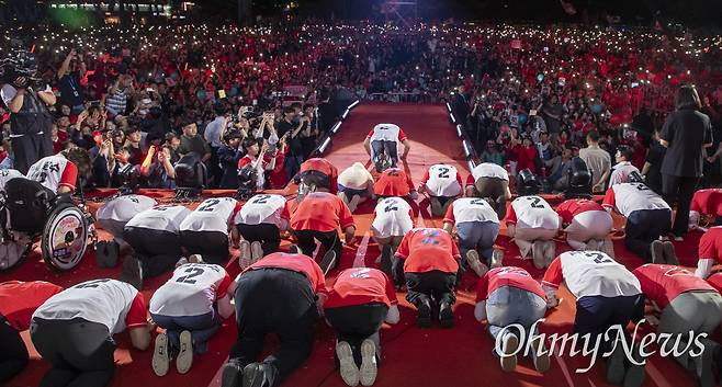 | ▲ 김문수 국민의힘 대선 후보가 2일 서울 중구 서울시청 광장에서 열린 피날레 유세에서 유권자들에게 지지를 호소하며 큰절하고 있다. |