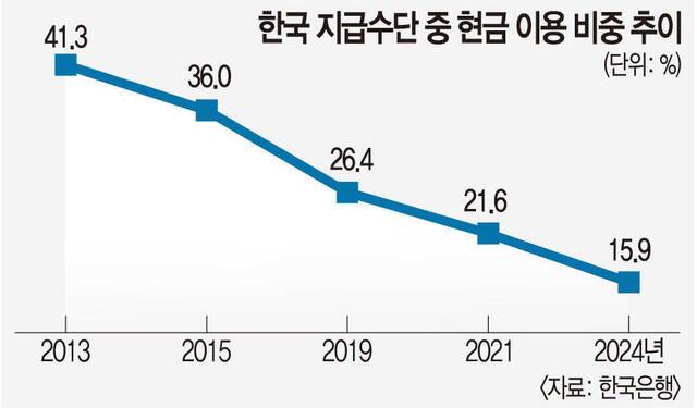 현금 이용 비중(건수 기준)도 10% 중반대로 떨어졌다. 2013년에 41.3%에 달했으나 2015년(36.0%) 30%대로 떨어지더니 지난해엔 15.9%까지 낮아졌다. 10년 전만 해도 10번 결제 시 4번은 현금을 썼는데, 이제는 1~2번 쓰는 셈이다. 결제액 기준 현금 비중은 이보다 더 떨어진다. 한은이 ‘2024년 지급결제보고서’에서 인용한 월드페이 자료에 따르면 한국의 현금사용도는 2023년 기준 10%로 집계됐다.