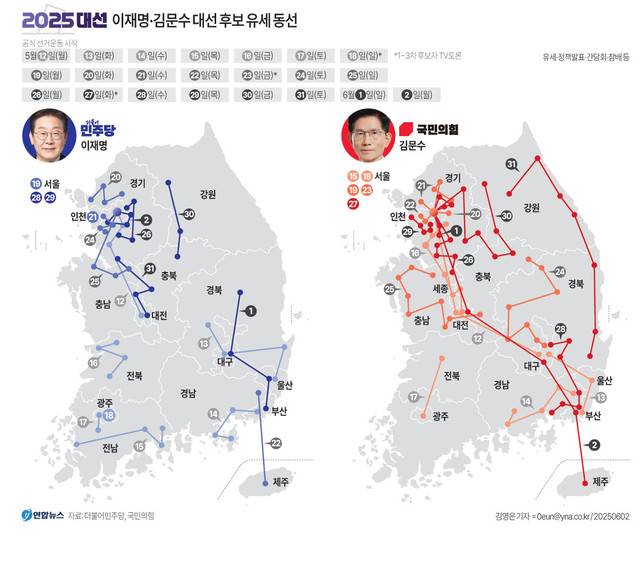 국민의힘 김문수 후보는 수도권과 영남권을 중심으로 하루 10곳 이상 발품 유세를 펼쳤다. 선대위 자체 집계에 따르면 김 후보는 22일간 선거 운동 기간에 총 157개 공개 일정을 소화하면서 7300㎞를 이동했다.