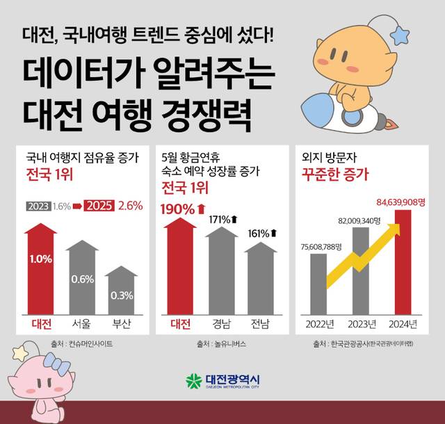 한국관광공사의 ‘2024년 지역별 방문객 통계’에서는 지난해 대전을 찾은 방문객 수가 전년 대비 3.1% 증가한 8463만여명으로 집계됐으며, 온라인 여행기업 ‘놀유니버스’가 발표한 5월 1~6일 숙박 예약 건수 역시 전년 대비 190% 늘어 전국 1위를 기록했다.