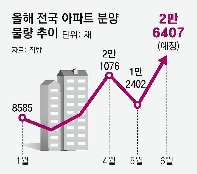 2일 부동산 플랫폼 직방에 따르면 이달 전국 아파트 분양 예정 물량은 2만6407채로 집계됐다. 지난해 6월 분양 실적(1만8969채)의 1.4배다.