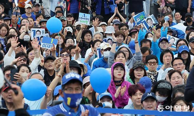 | “이재명” vs “김문수” 제21대 대통령 선거를 하루 앞둔 2일 대선 주자들이 마지막 유세전에 나선 가운데 지지자들도 세 결집에 나섰다. 서울 강북구 북서울꿈의숲 서문광장에서 더불어민주당 이재명 대선 후보 지지자들이 이 후보의 유세 현장을 지켜보며 응원하고 있다(위쪽 사진). 국민의힘 김문수 대선 후보 지지자들이 이날 오후 부산역광장 유세 현장에서 김 후보를 연호하고 있다. 이훈구 ufo@donga.com / 부산=장승윤 기자 |