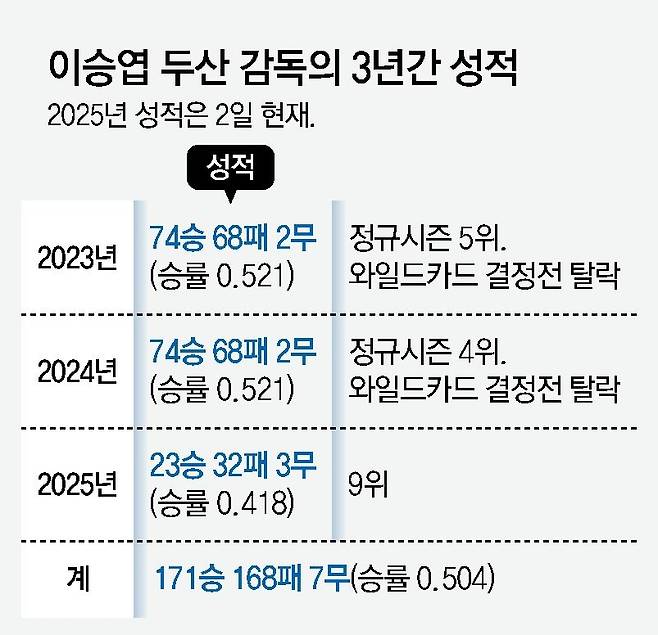 이번 시즌을 앞두고 스프링캠프를 찾은 박정원 두산 구단주는 “4, 5위 하려고 야구를 하는 것이 아니다. 열정을 갖고 최선을 다해서 베어스다운 야구로 팬들에게 보답해 주길 바란다”는 메시지를 남겼다. 절치부심한 이 감독 역시 명예회복을 별렀지만 팀은 초반부터 생각처럼 흘러가지 않았다. 개막 3연패로 시즌을 시작한 두산은 4월 중순 한때 4위까지 도약했지만 이후 줄곧 중하위권을 맴돌았다. 자유계약선수(FA)로 KT에 이적한 3루수 허경민(35)의 빈자리를 메우지 못했고, 토종 에이스 곽빈(26), 필승조 홍건희(33) 등의 부상 공백도 컸다. 두산은 5월 17일 이후 줄곧 9위 자리를 벗어나지 못했다.