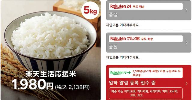 소비지 판매가격은 아이리스오야마가 5㎏당 2000엔(1만9185원), 라쿠텐이 1980엔(1만8993원)이다. 농림수산성이 5월26일 내놓은 5월12∼18일 전국 소매점 평균 쌀값 4285엔(4만1070원)의 절반 수준이다.