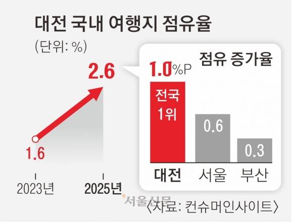 대전시는 최근 여행 전문 리서치기관 ‘컨슈머인사이트’가 발표한 월간 여행 동향에 따르면 1~4월 기준 여행지 점유율에서 대전(2.6%)이 2023년 대비 1.0%포인트 증가해 전국 최고 상승률을 기록했다고 2일 밝혔다. 서울(0.6%P), 대구(0.4%P), 부산(0.3%P) 등의 순이었다. 대표 관광지인 제주·강원은 각각 2.0%P, 1.4%P 하락해 대조를 보였다.