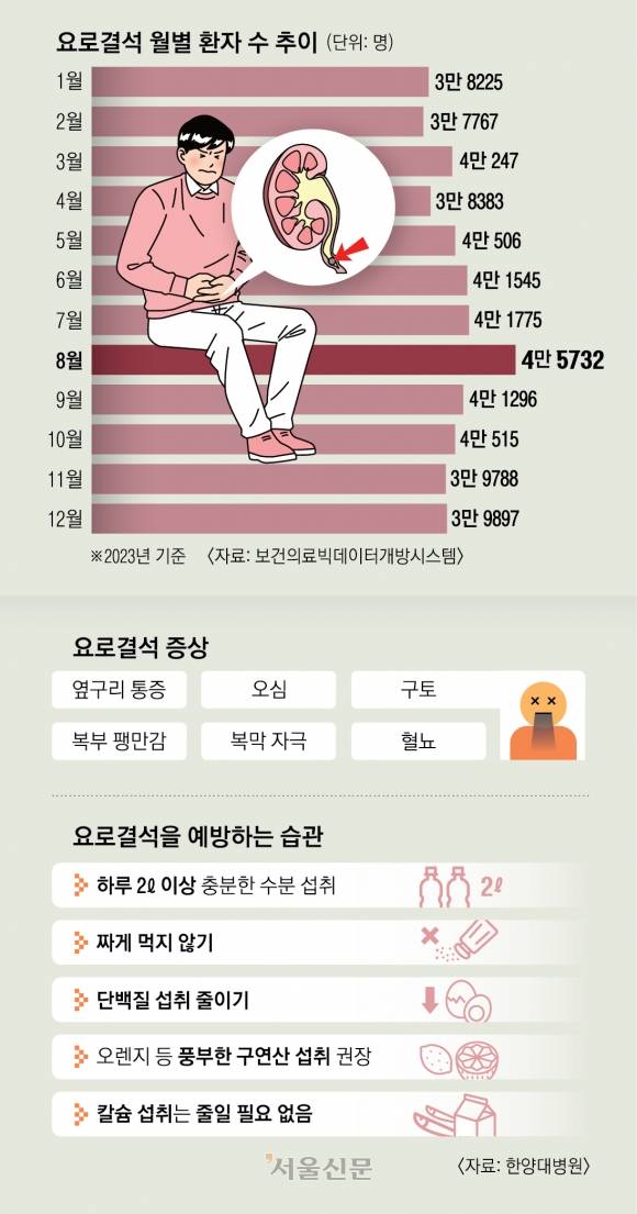 요로결석은 신장, 요관, 방광 등 소변이 생성되고 흐르는 ‘요로계’에 돌이 생기는 질환이다. 특히 여름철에 땀 배출이 늘면서 환자가 많이 증가한다. 2일 보건의료빅데이터개방시스템에 따르면 2023년 8월 요로결석으로 병원을 찾은 환자는 4만 5732명으로, 같은 해 1월(3만 8225명)보다 19.6% 많았다. 평소 짠 음식을 즐기고 물을 적게 마시는데, 어느 날 갑작스럽게 옆구리 통증이 찾아왔다면 요로결석을 의심할 필요가 있다.