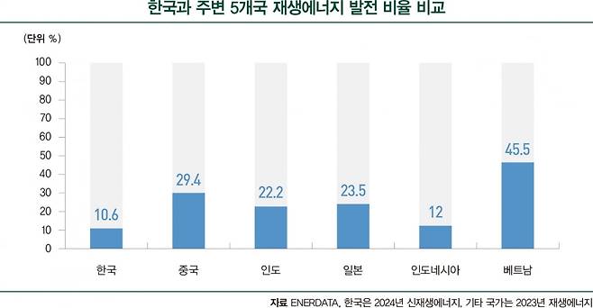인접국과 비교해도 한국의 에너지 전환 속도는 더디다. 에너지 통계 플랫폼 ENERDATA에 따르면, 2024년 기준 한국 주변 5개국의 재생에너지 발전 비중은 평균 26%에 달한다. 베트남이 45.5%로 가장 높았고 중국(29.4%), 일본(23.5%), 인도(22.2%), 인도네시아(12%)가 뒤를 이었다. 이는 2023년 기준이며, 한국이 신에너지를 포함하면서도 비중이 10.6%에 불과하다는 점을 고려하면 실제 격차는 더 크다.