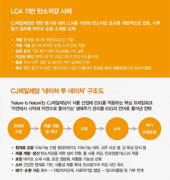 CJ제일제당의 햇반은 ESG 경영이 제품에 어떻게 접목되는지 보여주는 대표 사례다. CJ제일제당은 2023년 ‘환경을 생각한 햇반’을 출시하며 용기에 바이오 순환(Bio-circular PP) 소재를 25% 적용했다. 기존 제품 대비 탄소배출량을 17% 줄였다. 연간 예상 판매량 기준 탄소저감 효과는 편백나무 약 2100그루 이상이 흡수하는 탄소량에 해당한다.