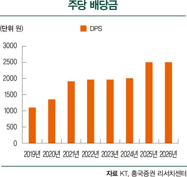 KT는 단기 실적뿐 아니라 ESG 측면에서도 주목받는다. 지배구조(G)와 주주환원 측면에서 높은 점수를 받고 있다. 2024년부터 시행한 분기배당은 2025년 들어서며 600원으로 20% 상향됐다. 연간 기준 DPS(주당 배당금)는 2500원으로, 예상 배당수익률은 약 4.9%에 달한다.