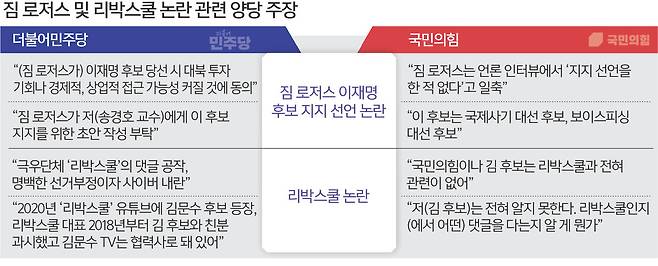로저스 “李 지지한 적 없다” 화상인터뷰 국힘 “민주 글로벌 사기극·거짓말 선동” 李 허위사실 공표 혐의로 검찰에 고발 민주 “극우단체 댓글 공작 사이버 내란 金 후보와 관계 규명돼야 할 문제” 맞불 경찰, 리박스쿨 대표 등 본격 수사 착수