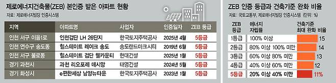부동산 업계에선 당분간 정부 가이드라인에 맞춘 제로에너지 설계 기준이 통용되겠지만 점차 ‘힐스테이트 레이크 송도’처럼 제로에너지건축물 5등급 인증을 받는 아파트가 속속 등장할 것으로 내다보고 있다. 5등급 인증을 획득하려면 건축비 부담이 커지지만 이 경우 용적률 등 인센티브 혜택을 누릴 수 있는 게 장점이다. 현행법상 제로에너지 1~5등급 인증 건축물은 건축기준 완화 비율이 11~15%로, 5등급 건축물은 최저 단계이긴 해도 용적률 11% 완화 인센티브가 제공된다. 예컨대 용적률 상한이 200%인 택지에 아파트를 짓는다면 최대 222%의 용적률을 적용받을 수 있다는 뜻이다. 한 대형건설사 임원은 “에너지 저감 기술력이 앞서고 시공 능력도 있는 회사라면 단지 여건을 봐서 제로에너지 5등급 예비인증을 받고 용적률 완화 혜택까지 누리는 게 낫다고 판단할 수 있다”고 짚었다.