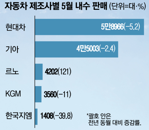 2일 국내 완성차 5개사가 발표한 ‘5월 내수 판매’ 자료에 따르면 현대자동차, 기아, KGM, 한국지엠 등 4곳의 내수 판매량이 지난해 5월에 비해 2.4~39.8% 하락한 것으로 나타났다. 르노코리아만 유일하게 지난해 하반기 출시한 그랑 콜레오스의 판매 호조로 전년 대비 개선된 5월 판매 실적을 발표했다.