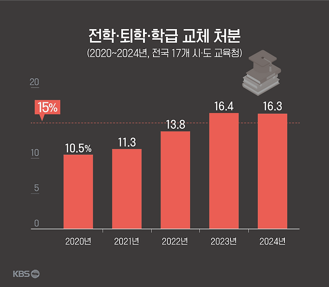 반면, 같은 기간 교보위에서 가해 학생에게 전학이나 퇴학, 학급 교체 처분을 내린 경우는 전체 교보위 개최 건수의 15% 안팎에 불과합니다.