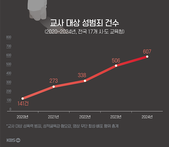 A 씨의 사례처럼, 교사를 대상으로 한 교내 성범죄는 최근 5년 동안 해마다 늘어나고 있습니다. 특히, 2023년부터 교사를 대상으로 한 딥페이크 범죄가 급격히 늘어나면서, 지난해에만 교사 대상 성범죄를 이유로 600건 넘는 교권보호위원회가 개최됐습니다.