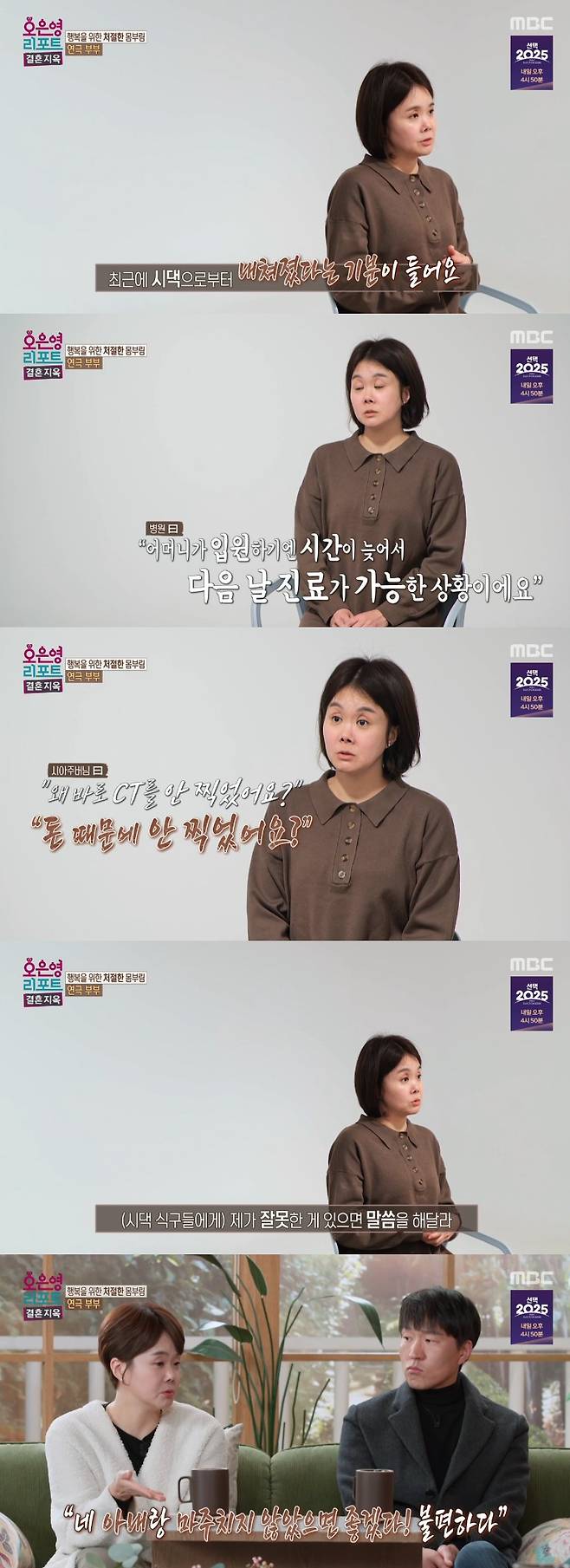 아내는 "결혼을 하고 2~3년 정도 있다가 시어머니께 연골이 파열되는 사고를 겪으셨다"며 이미 늦은 시간에 다음 날 진료받을 것을 권유받아 집으로 돌아와 시아주버님께 상황을 전했으나 '돈 때문에 안 찍었냐'는 말을 들었다고.