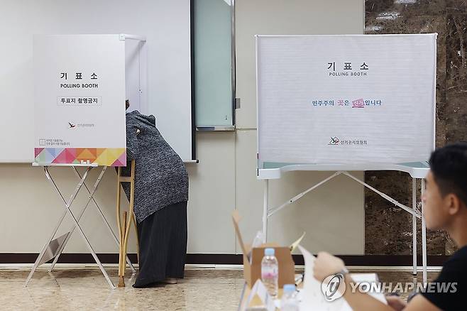 (서울=연합뉴스) 임화영 기자 = 제21대 대통령선거 투표일인 3일 서울 강남구 국민연금공단 서울남부지역본부에 마련된 논현1동제3투표소에서 목발을 짚은 유권자가 투표하고 있다. 2025.6.3