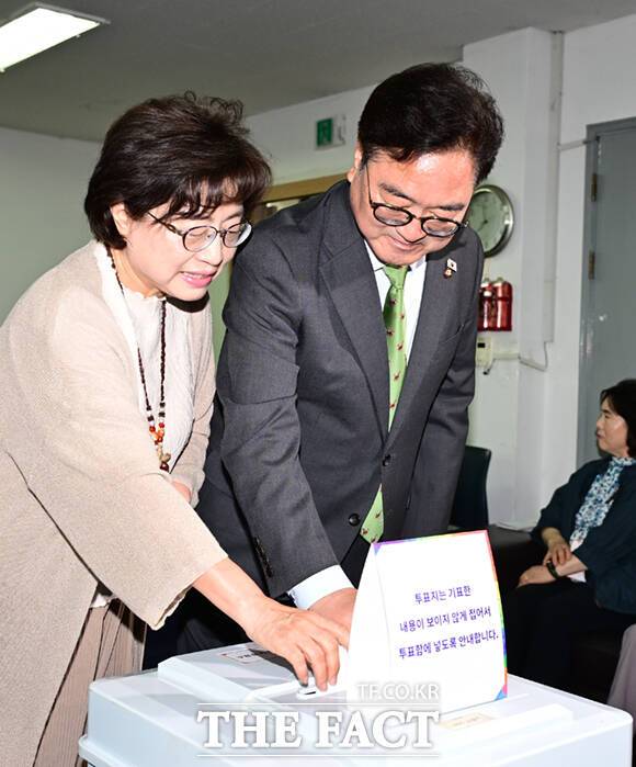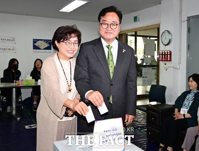 우원식 국회의장이 제21대 대통령선거일인 3일 오전 서울 노원구 공릉로 한청경로당에 마련된 투표소를 찾아 부인 신경혜 씨와 한 표를 행사하고 있다.