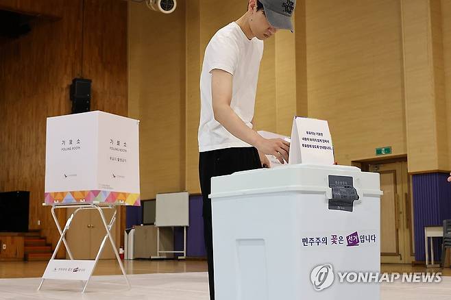 (대전=연합뉴스) 강수환 기자 = 제21대 대통령선거일인 3일 대전 서구 월평초등학교에 마련된 월평1동 제1투표소에서 한 유권자가 투표함에 투표용지를 넣고 있다. 2025.6.3