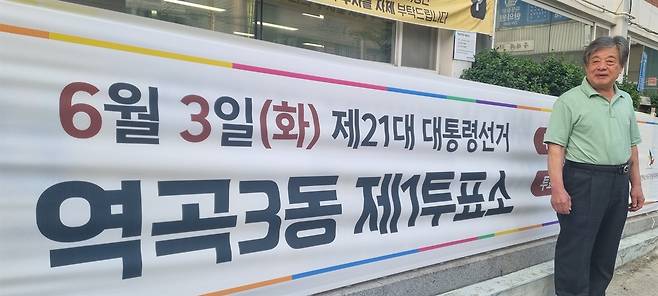 | ▲ [6.3 대선 투표 현장] 6월 3일 대통령선거 당일, 경기도 부천시 역곡3동 제1투표소 앞에서 가장 먼저 투표를 마친 김용식씨가 기념촬영을 하고 있다. |