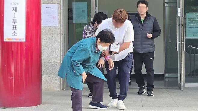 ▲ 3일 오전 인천시 옹진군 백령면 제1투표소에서 한 노인이 선거 안내원의 부축을 받으며 투표소에서 나오고 있다.