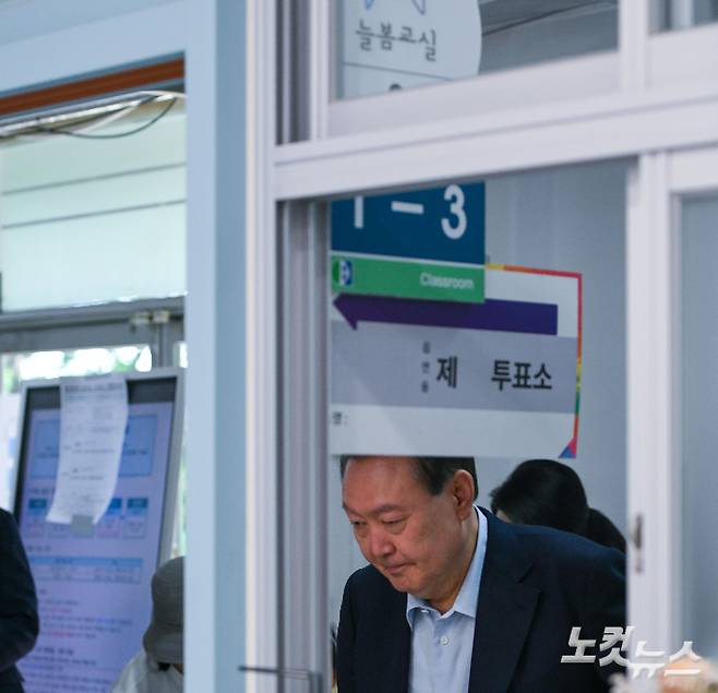 윤석열 전 대통령과 김건희 여사가 3일 서울 서초구 원명초등학교에 마련된 서초구 제3투표소에서 한 표를 행사하고 있다. 윤 전 대통령 부부는 이날 오전 9시 41분쯤 서초구 원명초등학교에 마련된 서초4동 제3투표소에 모습을 드러냈다. 윤 전 대통령은 남색 정장에 하늘색 셔츠를 입었다. 김 여사는 하얀색 재킷과 하얀색 셔츠 차림이었다.