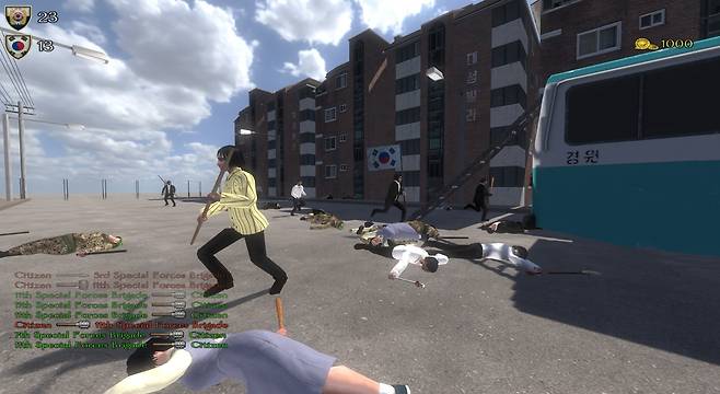 | ▲ 5·18기념재단이 국내 접속을 차단한 5·18 역사 왜곡 온라인 게임 '광주 런닝맨(Gwangju Running Man)'. 전두환의 사진을 걸고 계엄군과 시민들이 서로를 공격하는 등 역사적 가해자 중심의 시선으로 설계된 게임 내용을 담고 있다. |