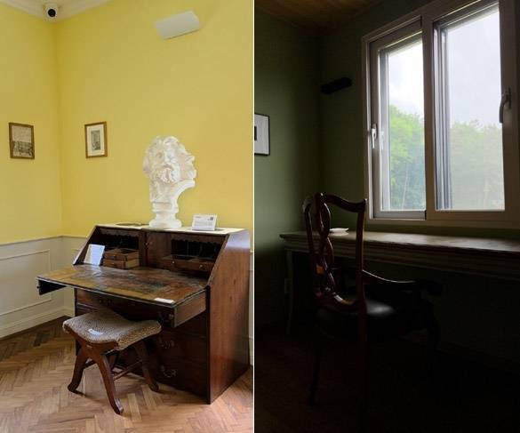 | ▲ '젊은 괴테의 집'에 전시된 괴테가 젊은 베르테르의 슬픔을 쓴 책상(비슷한 가구를 구입해 꾸몄다. 사진 왼쪽), '괴테 정원집' 내부, 10년 후의 계획을 쓰는 자리 (사진 오른쪽) |