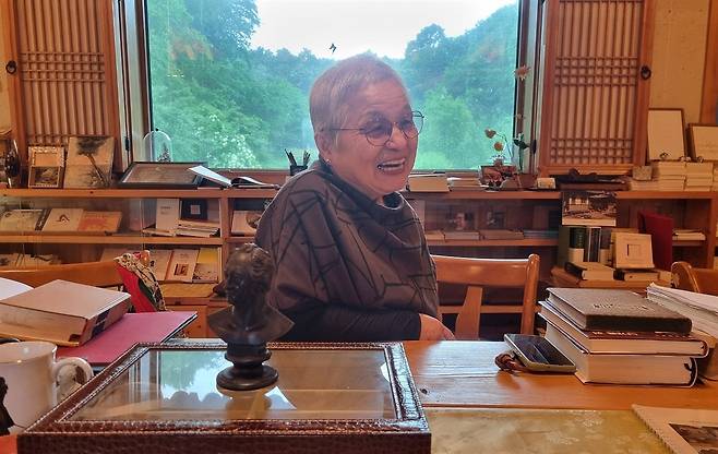 | ▲ 전영애 교수님과 나 책이 가득 쌓인 긴 나무테이블을 사이에 두고 교수님과 마주 앉았다. |