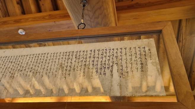 | ▲ 어머니가 열두 살 때 쓴 글씨, 여백재 천장에 걸려 있다. |