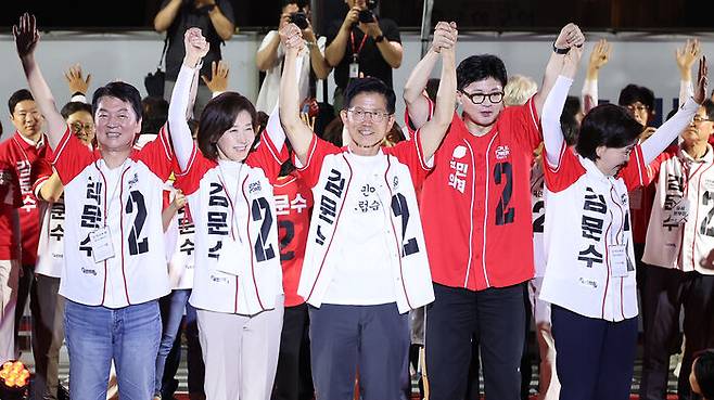 ▲ 2일 피날레 유세에서 지지를 호소하고 있는 국민의힘 김문수 대선 후보. 왼쪽부터 안철수 의원, 나경원 의원, 김 후보, 한동훈 전 대표, 양향자 전 의원.