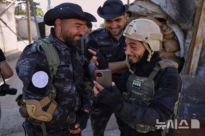 [알레포=AP/뉴시스] 2일(현지 시간) 시리아 알레포에서 시리아 과도정부와 쿠르드 주도 시리아민주군(SDF) 간 포로 교환이 진행되는 가운데, 정부 보안군 요원과 SDF 전투원이 함께 셀카를 찍으며 웃고 있다. 이날 양측은 올해 초 체결된 합의에 따라 총 470명의 포로를 교환한 것으로 전해졌다. 2025.06.03.
