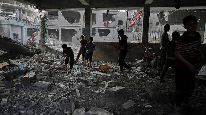 ▲ 이스라엘 공습으로 파괴된 팔레스타인 난민 대피소로 사용됐던 가자지구 내 학교