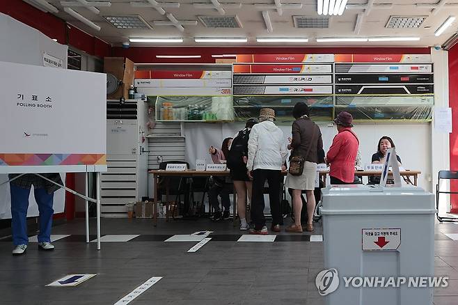 (서울=연합뉴스) 류효림 기자 = 21대 대통령선거 투표일인 3일 서울 서대문구 루마버텍스 썬팅샵에 마련된 남가좌제2동 제2투표소에서 유권자들이 투표하고 있다. 2025.6.3