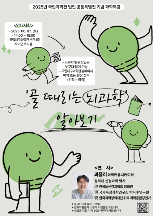 국립대구과학관이 2025년 공동특별전 '골때리는 뇌과학'과 연계한 과학특강을 6월 7일과 22일 이틀간 과학관 1층 사이언트리홀에서 개최합니다.